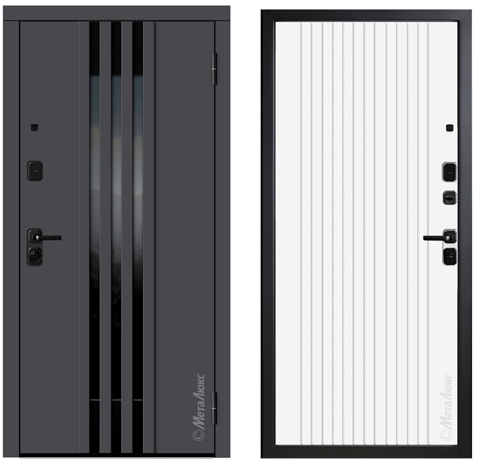 | ОТДЕЛКА СНАРУЖИ | Панель МДФ 12 мм, пленка, цвет «Графит» (78)/ декоративный штапик цвет «Графит» (78), вставка из черного глянцевого стекла, черная металлическая вставка |